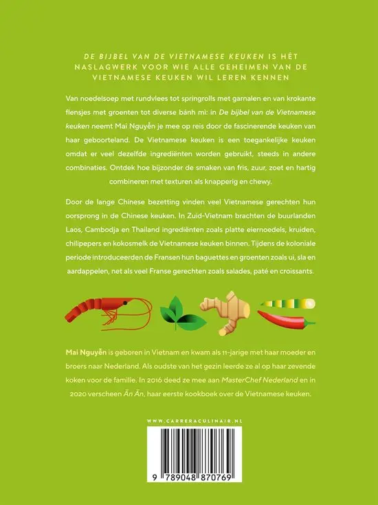 Van geurige phở met rundvlees tot knapperige springrolls met garnalen, van bánh xèo met groenten tot een klassieke bánh mì: in De bijbel van de Vietnamese keuken laat Mai Nguyen zien waarom deze keuken zo geliefd is. Dit complete naslagwerk neemt je mee langs de iconische smaken, ingrediënten en invloeden die Vietnam tot een culinaire schatkamer maken.