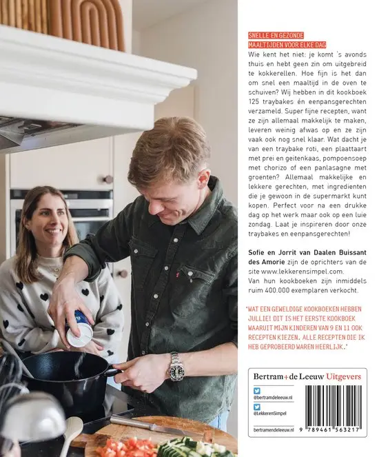 Na een lange dag geen zin om uitgebreid te koken? Dit kookboek biedt de oplossing met 125 heerlijke traybakes en eenpansgerechten. Makkelijk te maken, weinig afwas en vaak snel klaar. Geniet van gerechten zoals traybake roti, plaattaart met prei en geitenkaas, pompoensoep met chorizo en panlasagne met groenten. Alle recepten gebruiken ingrediënten die je gewoon in de supermarkt kunt kopen. Perfect voor drukke werkdagen en luie zondagen. Laat je inspireren door de eenvoudige en smakelijke creaties van Sofie en Jorrit van Daalen Buissant des Amorie, de oprichters van lekkerensimpel.com. Hun kookboeken zijn al meer dan 400.000 keer verkocht.